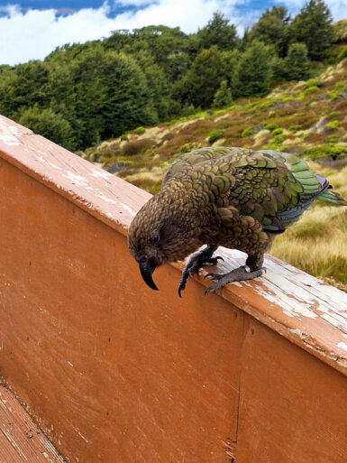 An der Hütte halten sich meist Kea auf. Sie haben es auf alles abgesehen, von Medikamenten über Lebensmittel bis hin zu Schnürsenkeln.