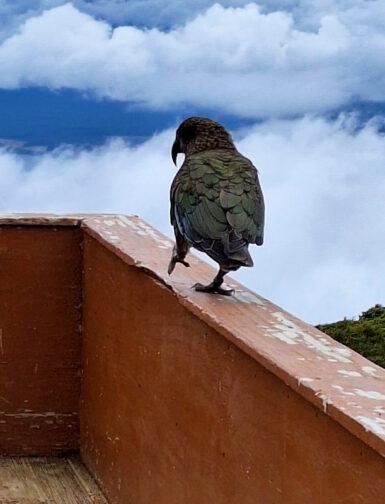 Auch ein Kea lässt sich blicken. Ich muss gut aufpassen, damit ich nicht die Nächste bin, die hier ihre Sachen verliert. Keas sind äußerst intelligent und neugierig, sie haben es auf alles abgesehen, von Lebensmitteln über Medikamente bis hin zu Schnürsenkeln.