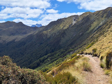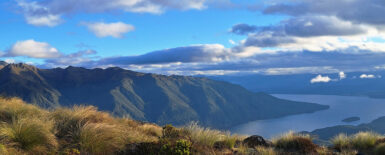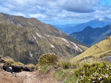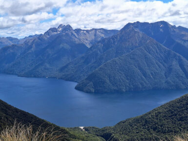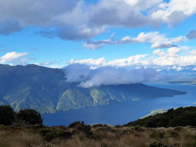 Schon nach kurzer Zeit öffnet sich ein beeindruckender Blick in die Tiefe: der Lake Te Anau liegt unter mir, aus dieser Höhe wirkt er fast wie ein Fjord. Je weiter ich steige, desto weiter reicht der Blick über eine scheinbar endlose Kette hoher Berge.
