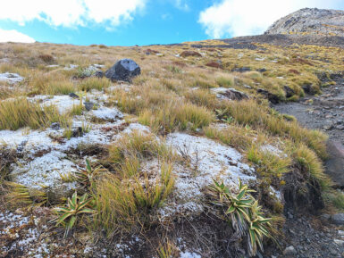 Der Blick am Morgen von der Luxmore Hut hinunter ins Tal ist einfach überwältigend. So hoch oben in den Bergen, so weit entfernt vom Rest der Welt – und doch nur einen Wandertag entfernt. Heute liegt eine lange Etappe vor mir: eine Gratwanderung mit spektakulären Aussichten. Vor der Hütte und auf den Bergen ist es weiß gezuckert vom Rauhreif. Doch das Wetter spielt mit, beste Voraussetzungen also.
