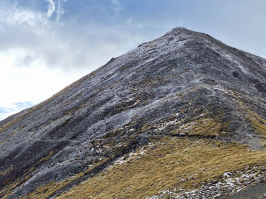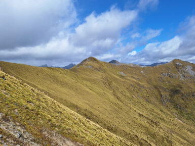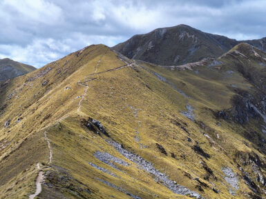 Nun beginnt der spektakulärste Abschnitt des Tages: Die nächsten Stunden wandere ich hauptsächlich oben auf dem Bergkamm. Der Weg ist nun ein wenig undulated – wellig würde es nicht ganz treffen – doch ich kann mich der einmalig schönen Aussichten unbesorgt erfreuen. Nur ein wenig aufpassen muss ich wegen der kräftigen Winde in dieser Höhe, ist doch der Kamm in Teilen recht schmal und an den Seiten gibt es keine großen Auslaufzonen.