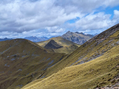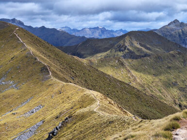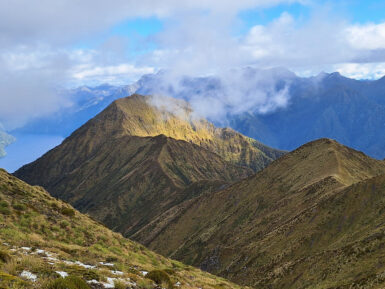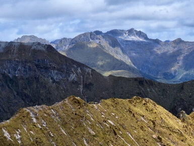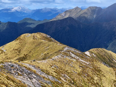 Unter mir liegt der Lake Te Anau, hinter mir liegen die bereits bewältigten Gipfel, vor mir schaue ich in die neuseeländischen Alpen – und schnell blicke ich auch ins nächste Tal, zum Lake Manapouri und auch runter auf die nächste Hütte bzw. den daneben fließenden Iris Burn. Sehr weit runter.