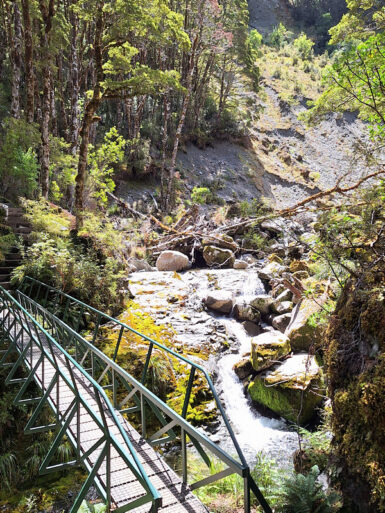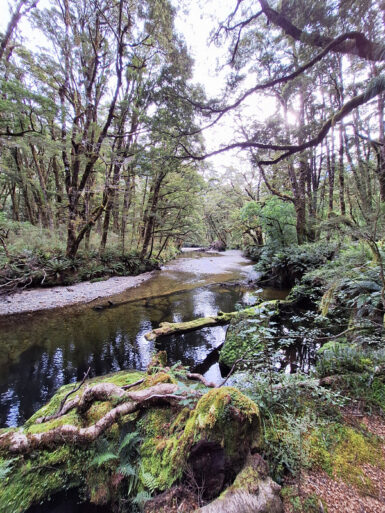 Die folgenden 600 Höhenmeter bewältige ich in zahllosen Serpentinen. Der Weg ist sehr gut angelegt, doch die Belastung für die Knie ist spürbar. Bald erreiche ich einen Zufluss des Iris Burn, ab hier ist der Abstieg zum Glück nicht mehr ganz so extrem. So kann ich um so mehr die schöne Waldlandschaft und die Flussüberquerungen genießen.