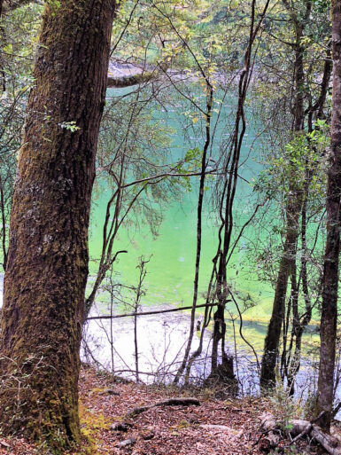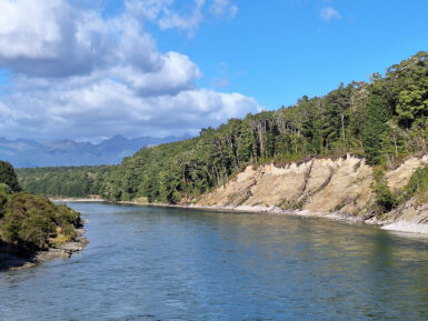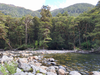 Direkt hinter dem See verschwindet der Weg wieder im dichten Wald, wo ich den Großteil des Tages verbringe. Ich überquere den Bach Forest Burn und bleibe ihm bis zu seiner Mündung in den Waiau River am sogenannten Balloon Loop treu. Hier beschreibt der Fluss eine eindrucksvolle Schleife, die sich tief in die Landschaft gräbt.