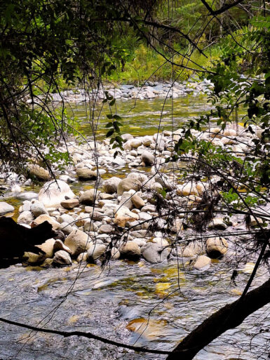 Heute ist auch wieder ein „Brückentag“, denn ich überquere mehrere kleine Bäche. Abwechselnd führen mich dichte Buschpassagen und offene Wegabschnitte talauswärts. Bald darauf erreiche ich den Rocky Point, der sich wunderbar für eine ausgiebige Pause eignet. Ich lasse mir Zeit, heute gibt es keinen Grund zur Eile.