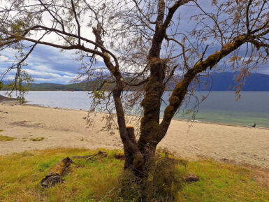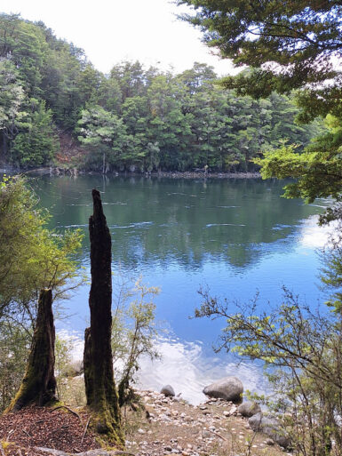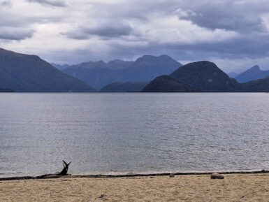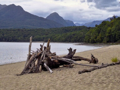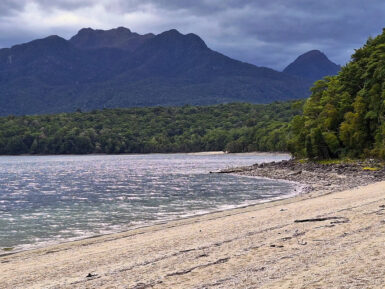Bevor ich die Mündung des Iris Burn erreiche – ich sehe sie nur aus der Ferne – schwenkt der Weg vom Ufer des Lake Manapouri ein wenig ins Landesinnere, bevor er mich schließlich wieder ans Wasser zurückführt. Die letzten knapp zwei Kilometer folge ich dem Seeufer bis zur Moturau Hut, die etwas oberhalb des Sees liegt. Das schöne Wetter nutze ich für ein ausgedehntes Sonnenbad auf der Wiese vor der Hütte. Ein wunderbarer Abschluss eines entspannten Tages.