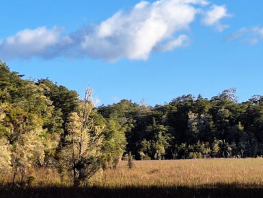 Nach der anspruchsvollen Etappe gestern, die meine volle Konzentration verlangte, steht heute ein entspannter Tag ohne große Anstrengung bevor. Dazu gibt es eine schöne Überraschung: Ein Mitwanderer aus Österreich begleitet mich auf der gesamten Strecke. Wir unterhalten uns lebhaft, tauschen unsere Erlebnisse und Neuseeland-Abenteuer aus und genießen die gemeinsame Zeit. So sehr vertiefe ich mich ins Gespräch, dass ich völlig vergesse, Fotos zu machen. Erst an der Moturau Hut fällt mir das auf. Was tun? Das Wetter ist herrlich, der Weg leicht, und ich bin früh an der Hütte angekommen. Also fälle ich spontan eine Entscheidung: Ich gehe das letzte Drittel des Weges einfach noch einmal zurück – und hole die versäumten Fotos nach.