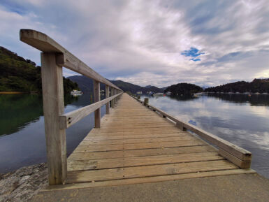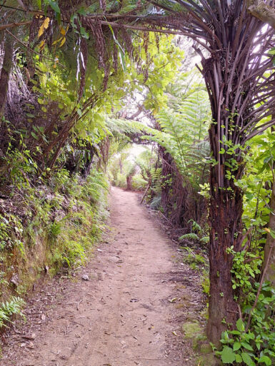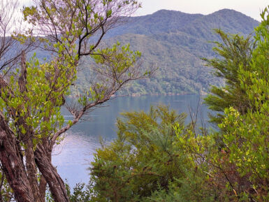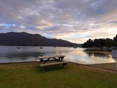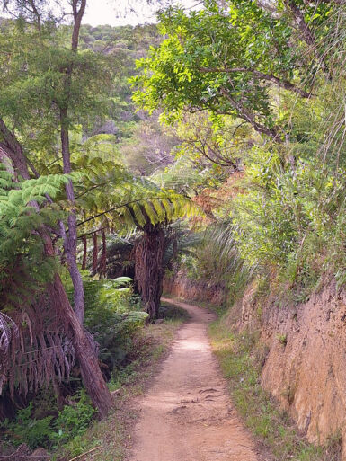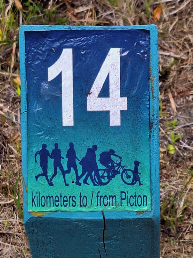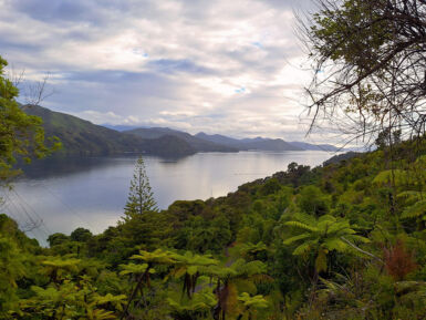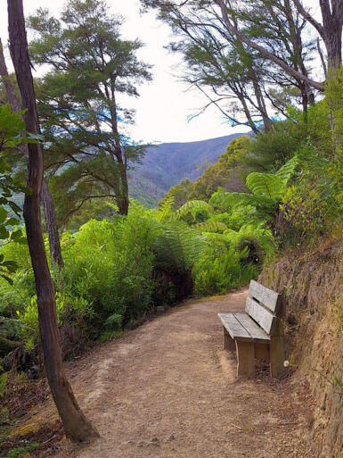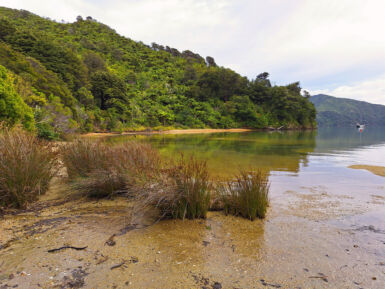 Ausgangspunkt unserer Wanderung ist der Campingplatz des Department of Conservation in Momorangi. Hier gibt es öffentliche Toiletten, Picknicktische und einen Campingshop. Nachdem wir den Queen Charlotte Drive überquert haben, führt der Weg oberhalb des Camps leicht ansteigend in Richtung Osten. Unterwegs überrascht eine Reihe von Aussichtspunkten mit Sitzgelegenheiten und weitem Blick über den Grove Arm. Die Vegetation ist vorwiegend einheimisch. Bei Bythells Bay, etwa auf halber Strecke, müssen wir einen plätschernden Bach überqueren.