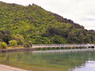 In der Nähe der Ngakuta-Bucht überqueren wir wieder die Straße. Ein kurzes Wegstück führt durch schöne alte Buchen zur Bucht. Dann geht es ein kurzes Stück am Strand entlang, vorbei an der öffentlichen Anlegestelle, den Picknicktischen und den Toiletten.