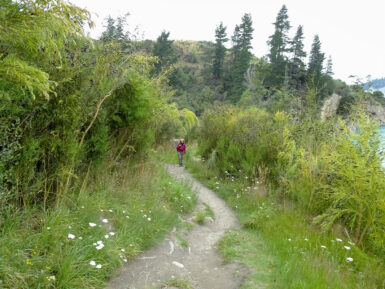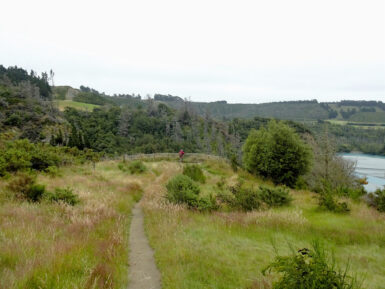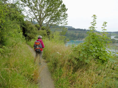 Schließlich kommen wir an eine Weggabelung. Von hier steigt der Pfad steil einen Hügel hinauf und führt in einer Schleife über eine offene Wiese zu einem weiteren Aussichtspunkt. Von dort bietet sich ein fantastischer Blick zurück auf den Fluss und hinaus auf die umliegenden Felder und Berge.