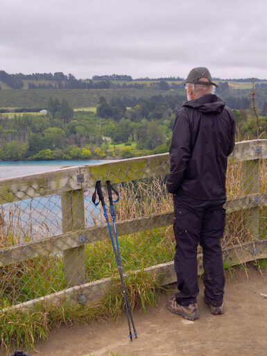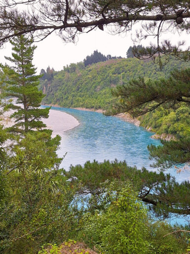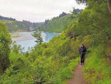 Der Weg führt zunächst in einen Wald und verläuft mit leichtem Auf und Ab. Wir folgen dem Flusslauf, der sich in weiten Kurven durch die Landschaft zieht. Durch den Regen ist der Pfad stellenweise sehr matschig. Nach einer Weile entfernt sich der Weg leicht von der Felskante, und wir erreichen den ersten Aussichtspunkt. Von hier bietet sich ein schöner Blick hinunter auf den Fluss, der sich nun allmählich verengt. Die bewaldeten Hügel zu beiden Seiten werden steiler, und in der Ferne tauchen die ersten Berge auf.