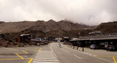 Ein Skidorf ohne Schnee an den Hängen eines aktiven Vulkans – ein Anblick, der fast surreal wirkt. In der kargen, felsigen Landschaft verstreuen sich zahlreiche Skihütten, teils neu, teils deutlich in die Jahre gekommen. Viele gehören Ski-, Wander- und Bergsteigerclubs aus dem ganzen Land. Heute aber ist vom winterlichen Trubel nichts zu spüren – alles liegt still und verlassen da. Offenbar gibt es hier immer wieder schneearme Winter – ein Hinweis darauf sind die Schneekanonen, die überall in der Umgebung stehen.
