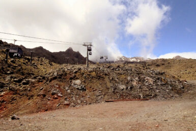 Die Landschaft ist ebenso bizarr wie faszinierend: farbiges Vulkangestein, moderne Skianlagen und weite Ausblicke verschmelzen hier zu einer Kulisse, die gleichermaßen befremdlich und beeindruckend wirkt.
