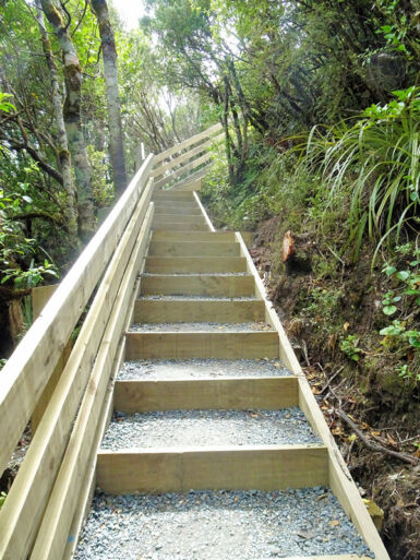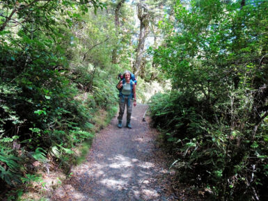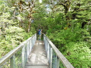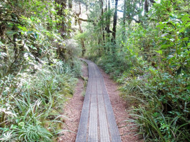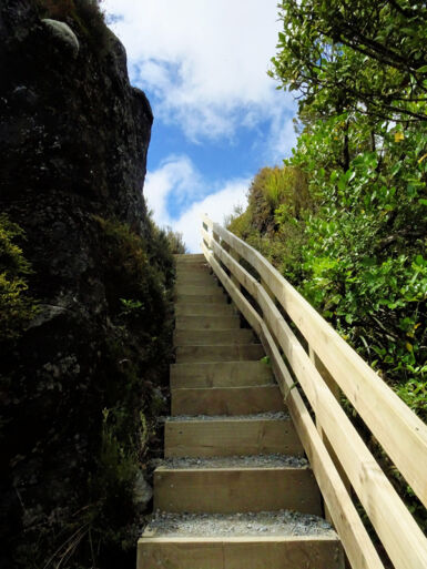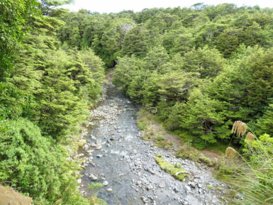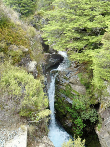 Entlang des Wairere Stream wandern wir durch dichten Südbuchenwald. Nach Verlassen des Waldes überqueren wir auf einer Holzbrücke den Fluss. Rechts sehen wir einen ersten kleinen Wasserfall, links die Schlucht des Wairere Stream. Entlang des Flusses geht es weiter bergauf und bald sehen wir die beeindruckenden Taranaki Falls vor uns. Hier hat sich der Wairere Stream seinen Weg durch ein mächtiges Lavafeld gebahnt und stürzt von der Kante des Lavastroms 20 Meter tief in einen von Felsblöcken umgebenen Pool.