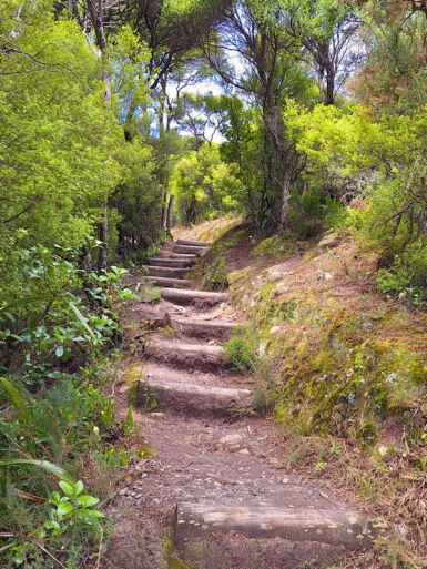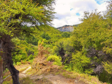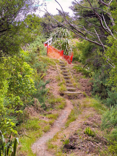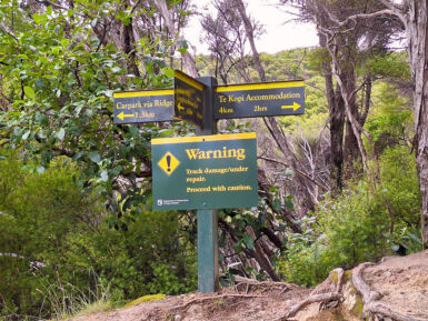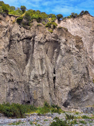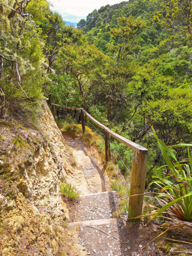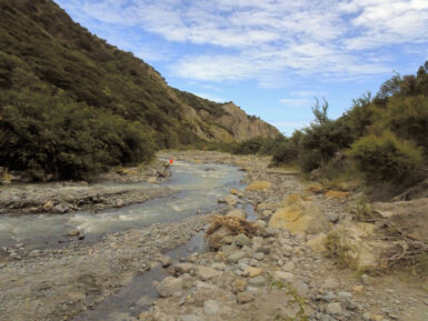 Drei aufregende Routen führen zwischen den spektakulären Pūtangirua Pinnacles hindurch oder zum atemberaubenden Aussichtspunkt. Sie alle starten am idyllischen Bachbett beim Parkplatz und führen uns mal links und mal rechts des Ufers entlang. Vereinzelte Pfähle weisen den ungefähren Weg, und nach Unwettern wird es wohl immer ein anderer sein. Ausgebaut ist jedenfalls nichts, aber die grobe Richtung ist ja klar.