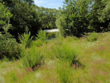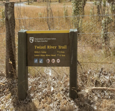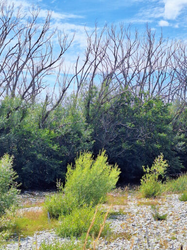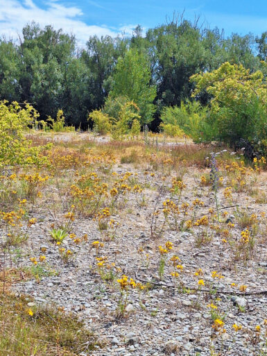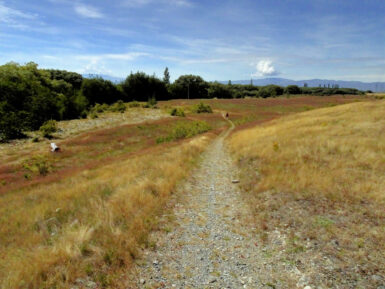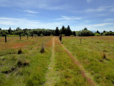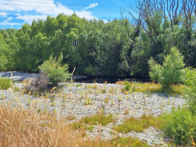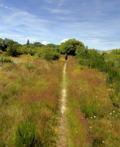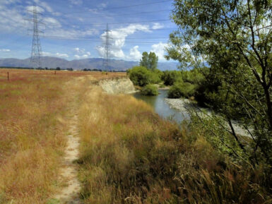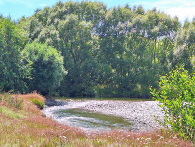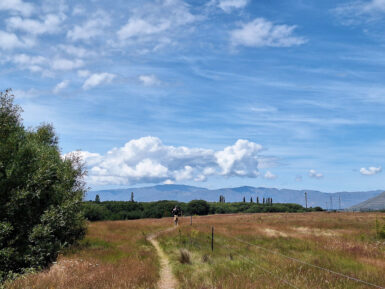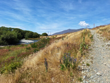 Die Sonne brennt vom Himmel, es ist heiß. Ein schattiger Platz unter den Sonnenschirmen eines kleinen Cafés wäre jetzt verlockend, aber wir wollen uns bewegen. Also entscheiden wir uns für den Twizel River Trail, in der Hoffnung, dort unter Bäumen ein bisschen Schatten zu finden. Vom Fluss sehen wir nicht viel, er führt kaum Wasser und schlängelt sich versteckt durchs Gebüsch. Der Weg selbst verläuft oberhalb des Ufers durch die typisch braun-gelbe Tussock-Steppe. Kein Schatten weit und breit, dafür flimmert die Hitze über dem Pfad.