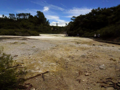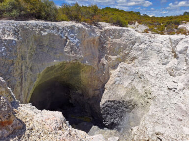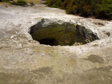 Die Geschichte: Im Jahr 1906 entdeckten Gefangene eines Straflagers in der Gegend von Wai-O-Tapu, dass die heiße Quelle, in der sie ihre Wäsche wuschen, heftig auf Seifenlauge reagierte – sie spuckte plötzlich heißes Wasser aus. Der Lagerleiter Scanlon griff die Idee auf: Er verengte die Öffnung der Quelle mit einem Stahlrohr, wodurch der Wasserdruck – und damit die Höhe der Fontäne – deutlich zunahm. Rundherum formte er mit Bimsstein einen Kegel, der dem Geysir sein markantes Aussehen verlieh. So entstanden beeindruckende Ausbrüche mit bis zu 17 Metern hohen Wasserfontänen, die mitunter mehrere Stunden andauerten. Bereits im Dezember 1906 berichtete der New Zealand Herald über den sogenannten „Northland Geyser“, woraufhin immer mehr Besucher kamen und der künstlich geschaffene Geysir zur Attraktion wurde. Mit der Zeit lagerten sich Mineralien auf dem Bimsstein ab und formten den Austrittskegel so, dass er heute aussieht, als wäre er ganz natürlich entstanden.
