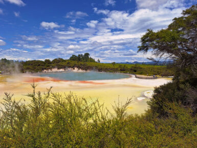 Das Wai-O-Tapu Thermal Wonderland (Wai-o-tapu heißt übersetzt “heiliges Wasser”) ist ein Ort, an dem die Erde selbst zu atmen scheint. Hier, inmitten einer geothermischen Landschaft, brodeln heiße Quellen, dampfen schwefelhaltige Geysire und entstehen Pools in leuchtenden Farben, die fast unwirklich wirken. Auf dem Rundweg durch dieses außergewöhnliche Naturwunder erlebt man die Kraft der Erde hautnah – der Schwefelgeruch liegt in der Luft, während die Farben der heißen, mineralreichen Gewässer von Smaragdgrün bis Gelb und Orange schimmern.