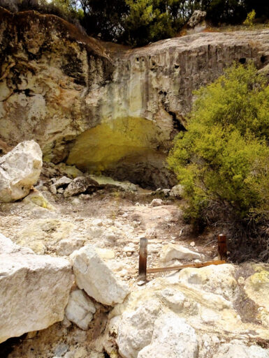 Eine gelbe Schwefelhöhle mit dampfenden Quellen – wild, bizarr und voller Kontraste.
