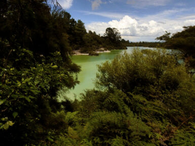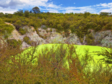 Das Wai-O-Tapu Thermal Wonderland ist der Klassiker unter Neuseelands Thermalgebieten. Hier findet man einige der spektakulärsten geothermischen Attraktionen des Landes – darunter der knallrote Champagne Pool, das dampfende Devil’s Bath und imposante Schlammbecken. Knallgrüne, blaue und graue Seen blubbern leise zwischen weiß und gelb verkrusteten Felsen, heiße Bäche gluckern über Sinterterrassen.