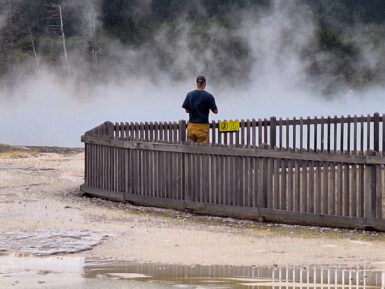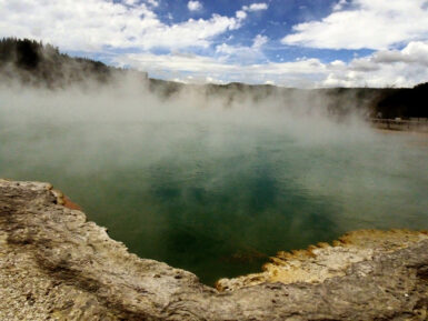 Das bis zu 74°C heiße Wasser verdampft so stark, dass man das andere Ufer kaum erkennen kann. Der orangefarbene Rand, gesättigt mit Arsen, Antimon, Quecksilber, Thallium, Gold und Silber, macht diesen brodelnden Pool zu einem echten Naturwunder.