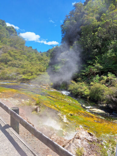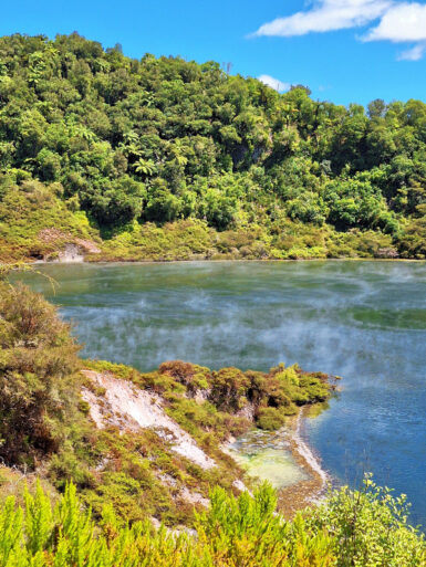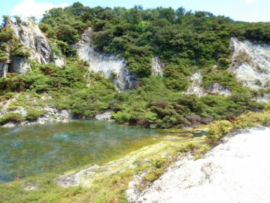 Nach der Wanderung durch das atemberaubende grüne Tal wird uns klar: Waimangu bedeutet zwar schwarzes Wasser, aber dieser Name kann der Schönheit des Tals nicht annähernd gerecht werden. Tatsächlich hat Mutter Natur hier die leuchtendsten Farben von giftig Grün bis Azurblau, von schwefeligem Gelb bis Zartrosa mit großer Geste über die Vulkanlandschaft ausgeschüttet und so eine farbenfrohe, mystische Landschaft entstehen lassen, die ihresgleichen sucht. Diese Eindrücke werden uns noch lange in Erinnerung bleiben.