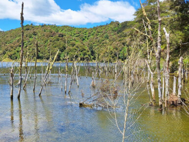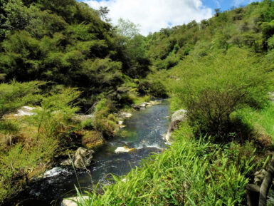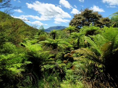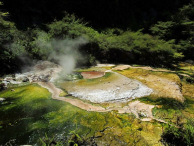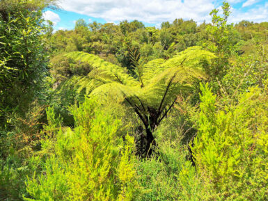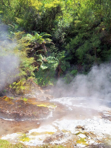 „How the world began“ – so steht es am Eingang des Waimangu Volcanic Valley. Bei einer Wanderung durch dieses grüne Höllental spüren wir die Urgewalten der Erde hautnah. Am 10. Juni 1886, gegen drei Uhr morgens, brach der Mount Tarawera aus: 22 Krater explodierten gleichzeitig, spalteten den Berg, schleuderten Asche und Gestein über 10 Kilometer hoch und rissen einen 17 Kilometer langen Riss in die Erdkruste. Die einst weltberühmten Pink and White Terraces am Lake Rotomahana – Neuseelands damalige Top-Attraktion – verschwanden vollständig, an ihrer Stelle klaffte ein 100 Meter tiefer Krater. Die Eruptionen vernichteten die gesamte Pflanzen-, Tier- und Vogelwelt der Region. Heute hat sich der Tarawera wieder beruhigt, ein weiterer Ausbruch gilt als unwahrscheinlich. Auf unserer Wanderung durch das jüngste Thermalgebiet der Erde sehen wir, wie sich die Natur seit über 125 Jahren ihr Terrain zurückerobert.