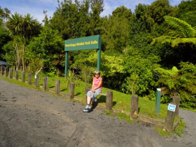 Vom Campingplatz in Raglan fahren wir auf einer schmalen, aber guten Straße gut 20 Kilometer bis zum Bridal Veil Falls Car Park.