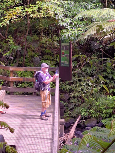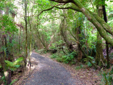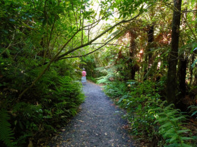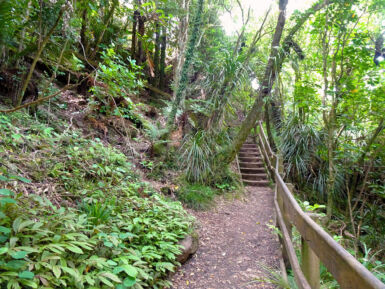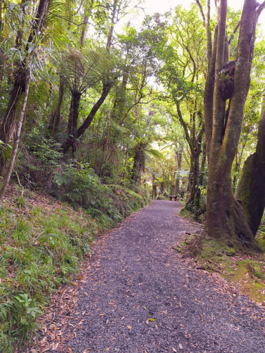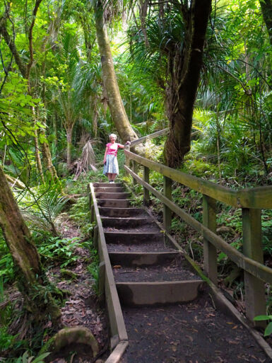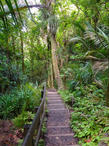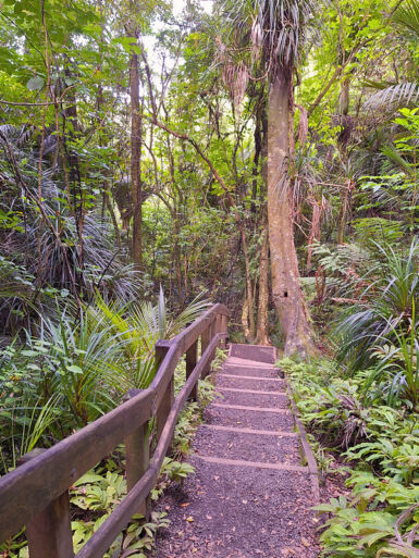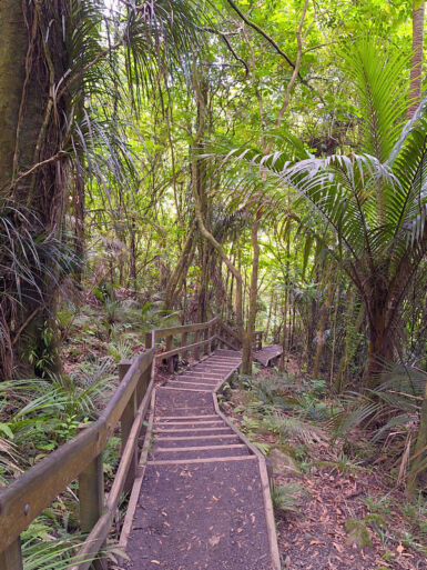 Nach ausgiebigem Schauen und Fotografieren müssen wir die 261 Stufen wieder hinaufsteigen. Dabei genießen wir die Kühle des neuseeländischen Waldes.