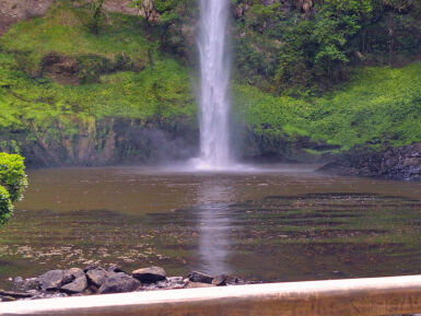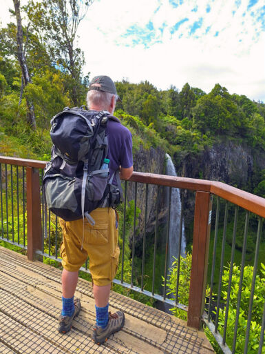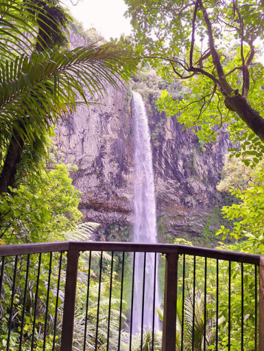 Vom Parkplatz aus wandern wir auf dem breiten, gut begehbaren Weg durch den Regenwald in ca. 10 Minuten zu den beiden oberen Aussichtsplattformen. Hier, am oberen Ende der Wasserfälle, haben wir einen spektakulären Blick auf die Wasserfälle und die umliegende Landschaft.