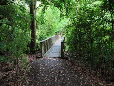 Unser Rundweg durch das Karstlabyrinth endet an einer kleinen Holzbrücke, über die wir auf einem Schotterweg durch den grünen Regenwald zurück zum Parkplatz gelangen.