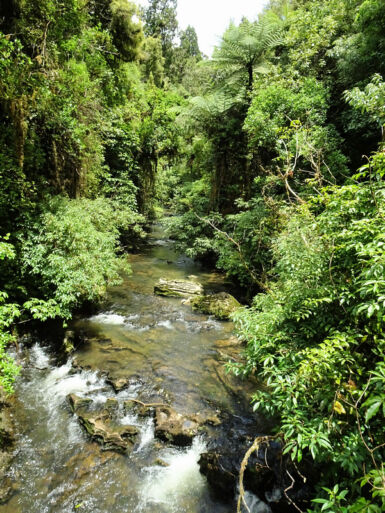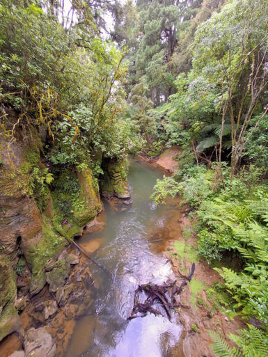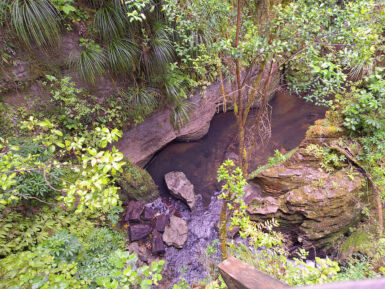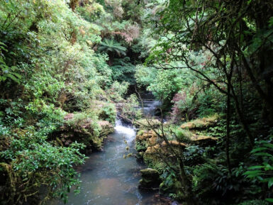Nach kurzer Zeit passieren wir den großen Parkplatz und das Besucherzentrum der Waitomo Glowworms Cave. Die Waitomo Cave ist berühmt für ihre sogenannten Glowworms (Arachnocampa luminosa, lange, klebrige, durchsichtige, wurmförmige Pilzmückenlarven, die von den Decken hängen, nicht zu verwechseln mit den deutschen Glühwürmchen). Schon am frühen Morgen ist der Andrang groß – trotz des nicht gerade geringen Eintrittspreises – schnell verlassen wir den belebten Platz. Der schmale Pfad führt weiter durch die Schlucht, die der Waitomo Stream gegraben hat.