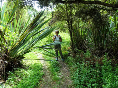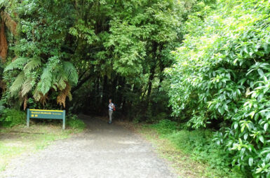Doch dann – Überraschung! Wir sind gerade mal 45 Minuten gewandert und stehen plötzlich vor einer Absperrung. Ein Schild informiert uns, dass der Waitomo Walkway aufgrund von Unwetternschäden durch den Zyklon Gabrielle bis auf weiteres gesperrt ist. Etwas ratlos stehen wir vor der Sperre, was sollen wir tun, auf unser eigentliches Ziel, den Ruakuri Bushwalk, wollen wir nicht verzichten. Schließlich kehren wir um, wandern zurück zum Campingplatz und fahren mit dem Camper das kurze Stück zum Parkplatz des Ruakuri Cave Visitor Centers.