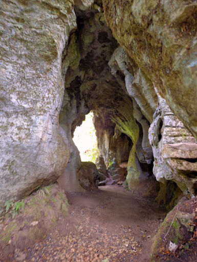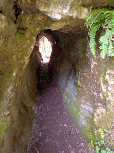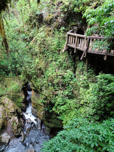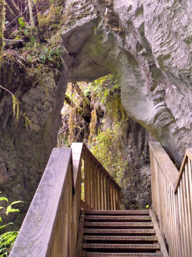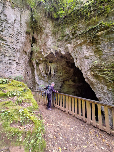 Vom Parkplatz aus wandern wir in eine schluchtartige Landschaft, umgeben von moosbedecktem Wald. Es ist einfach wunderschön. Der Weg führt durch den ersten Tunnel und schlängelt sich auf schmalen Holzstegen über den tief eingeschnittenen Flusslauf. An einer Weggabelung geht es über Stufen hinunter in eine riesige Höhle, die den Blick in einen unterirdischen Gang freigibt, in dem der Fluss für kurze Zeit verschwindet. Weiter windet sich der Weg durch ein überwuchertes Felstor mit unzähligen Winkeln und Nischen. Dann geht es zu einem Wasserfall, der komplett von Laub umgeben ist und so eine echte Dschungelatmosphäre vermittelt. Ein weiterer Tunnel ist zu durchqueren, der mit zahlreichen Stalagmiten und Stalaktiten gespickt ist.