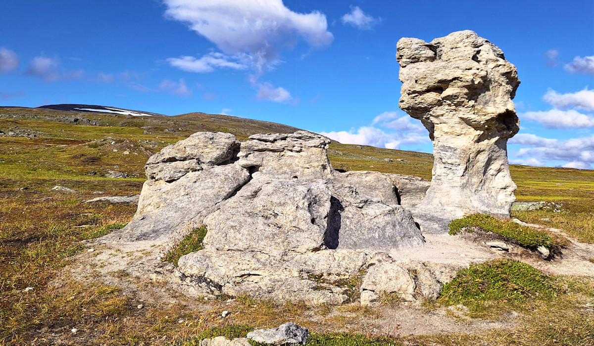 Der Pårka-Sattel ist ein 895 Meter hoher Pass am Padjelantaleden, auf der Etappe zwischen der Låddejåhkå-Hütte und den Árasluokta-Hütten. Von der Låddejåhkå-Hütte führt der Weg zunächst am rauschenden Fluss entlang, dann über eine schwingende Hängebrücke, und schließlich steil und schweißtreibend hinauf auf den Sattel. Schon von weitem ist das Ziel zu sehen: eine verwitterte Felsformation, die dort oben seit ungezählten Jahren steht, unbeirrt den Stürmen, dem Regen und dem Frost trotzend. Von der Höhe öffnet sich der Blick weit über das Land, bevor der Pfad wieder hinabführt, über die Brücke am Miellädno und weiter zu den Árasluokta-Hütten.