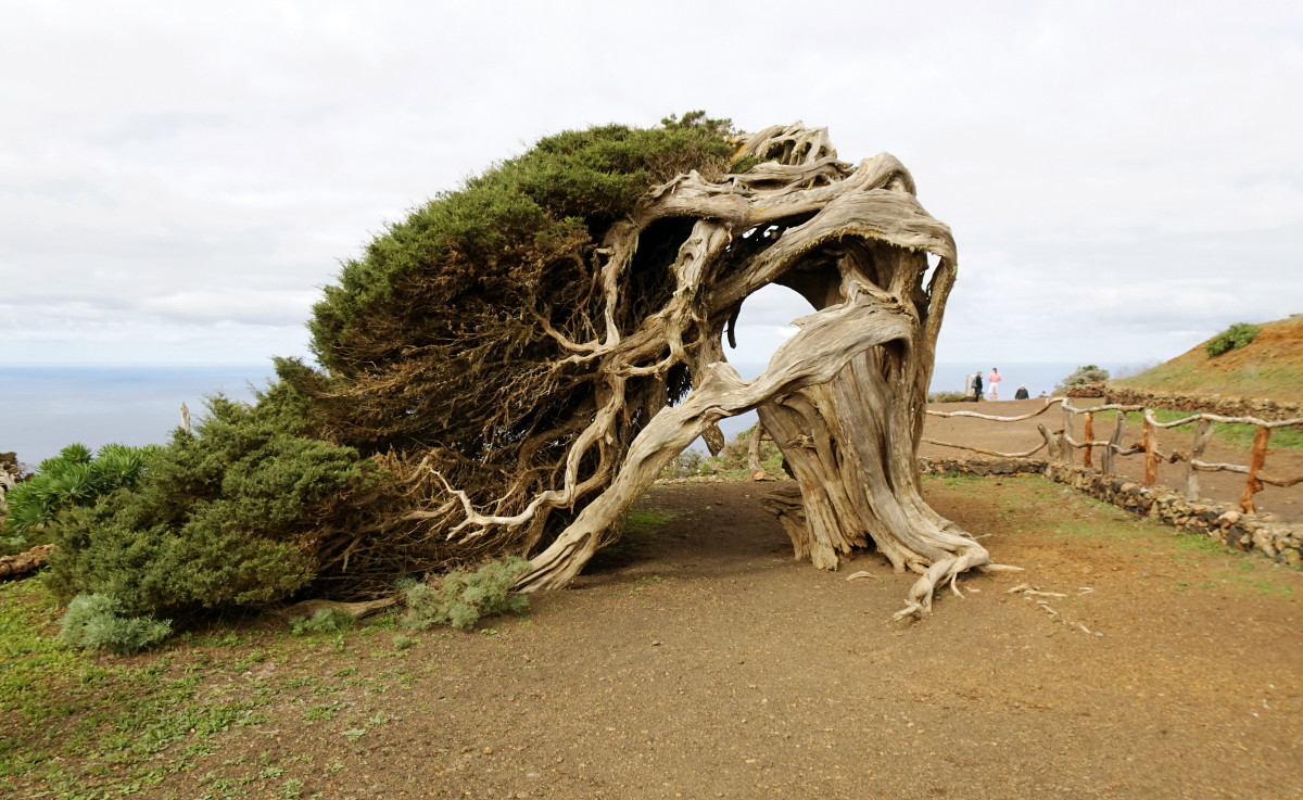Auf der Hochebene La Dehesa wachsen die wohl bekanntesten Bäume El Hierros: die mystisch anmutenden, vom Wind geformten Zedernwacholder von El Sabinar. Vom Mirador de Lomo Negro führt ein schöner Wanderweg hinauf auf die Hochebene und zu diesen außergewöhnlichen Bäumen. Anschließend geht es weiter in Richtung eines der eindrucksvollsten Aussichtspunkte im Süden der Insel, dem derzeit leider gesperrten Mirador de Bascos. Vom nahegelegenen Gipfel eröffnet sich ein überwältigender Blick über das Tal von El Golfo bis hinaus auf den tiefblauen Atlantik. Den Abschluss der Wanderung bildet die von weißen Mauern umgebene Ermita Virgen de Los Reyes mit ihrer verehrten Madonnenstatue.
