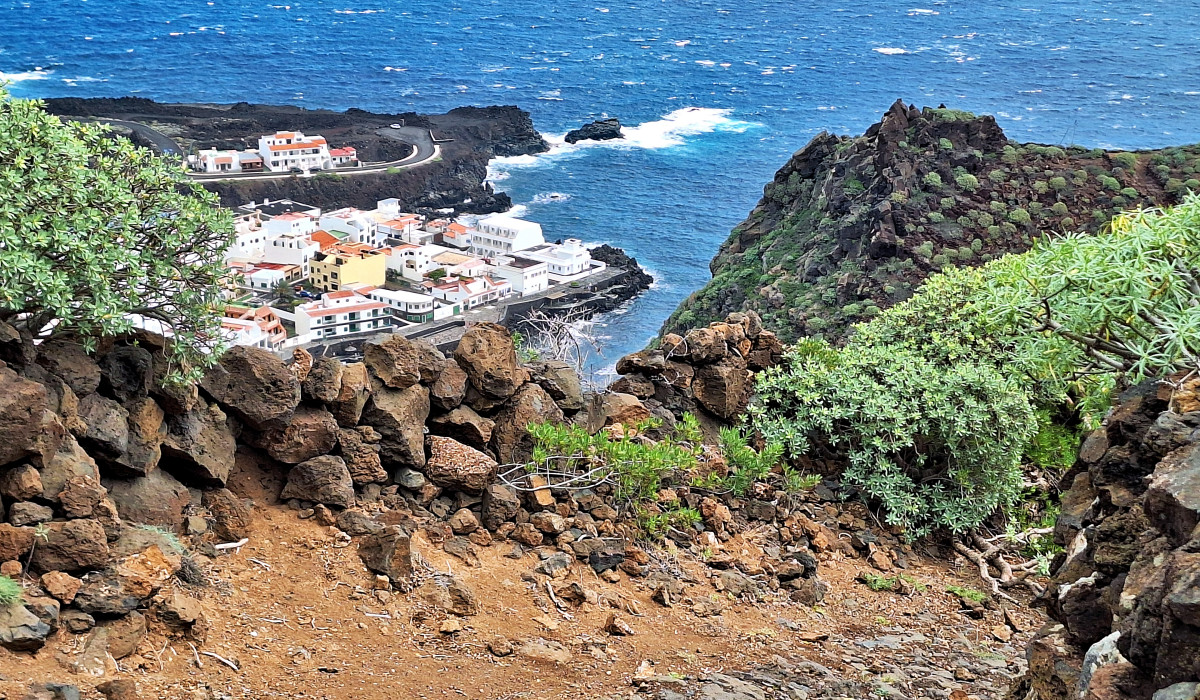 Diese Wanderung verbindet die Hauptstadt von El Hierro mit der wilden Lavaküste im Norden der Insel. Ausgangspunkt ist Valverde, von wo der Weg stetig bergab durch den Nordhang der Insel führt. Als Teil des gut ausgeschilderten GR-131 verläuft die Route bis zum Strand von Tamaduste. Es folgt eine leichte Wanderung entlang der Lavaküste zum Mirador Roque de las Gaviotas, dem Mövenfelsen. Vor der Küste ragt der markante Felsen mit sechseckigen Basaltklippen aus dem Meer, dazu kommen eindrucksvolle Felsbögen entlang der rauen Küstenlinie. Der Rückweg führt steil durch die Lavagrushänge des Vulkans La Cancela, dessen Flanke mit herrlichem Tiefblick auf Tamaduste gequert wird. Durch ein wildromantisches, von Flechten überzogenes Lavafeld und vorbei an Weinbergen schließt sich der Rundweg schließlich wieder in Valverde.