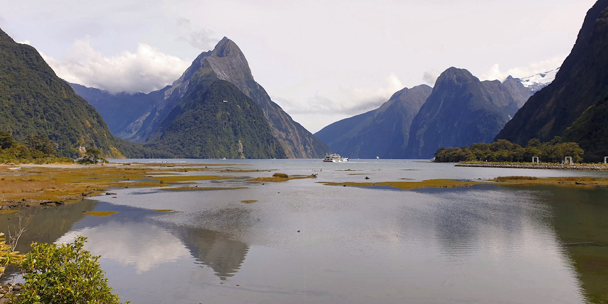 Abseits des Trubels am Hafen, wo zahlreiche Touristen auf ihre Bootstouren durch den Fjord warten, finden sich auch ruhigere Ecken: Der Milford Foreshore Walk etwa ist vergleichsweise wenig frequentiert. Auf dem Weg wandern wir durch urige Buchenwälder, teils über Holzstege und entlang des sandigen Ufers, stets begleitet von einem beeindruckenden Blick auf den markanten Mitre Peak.