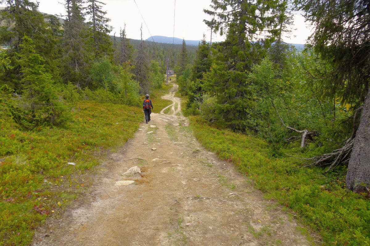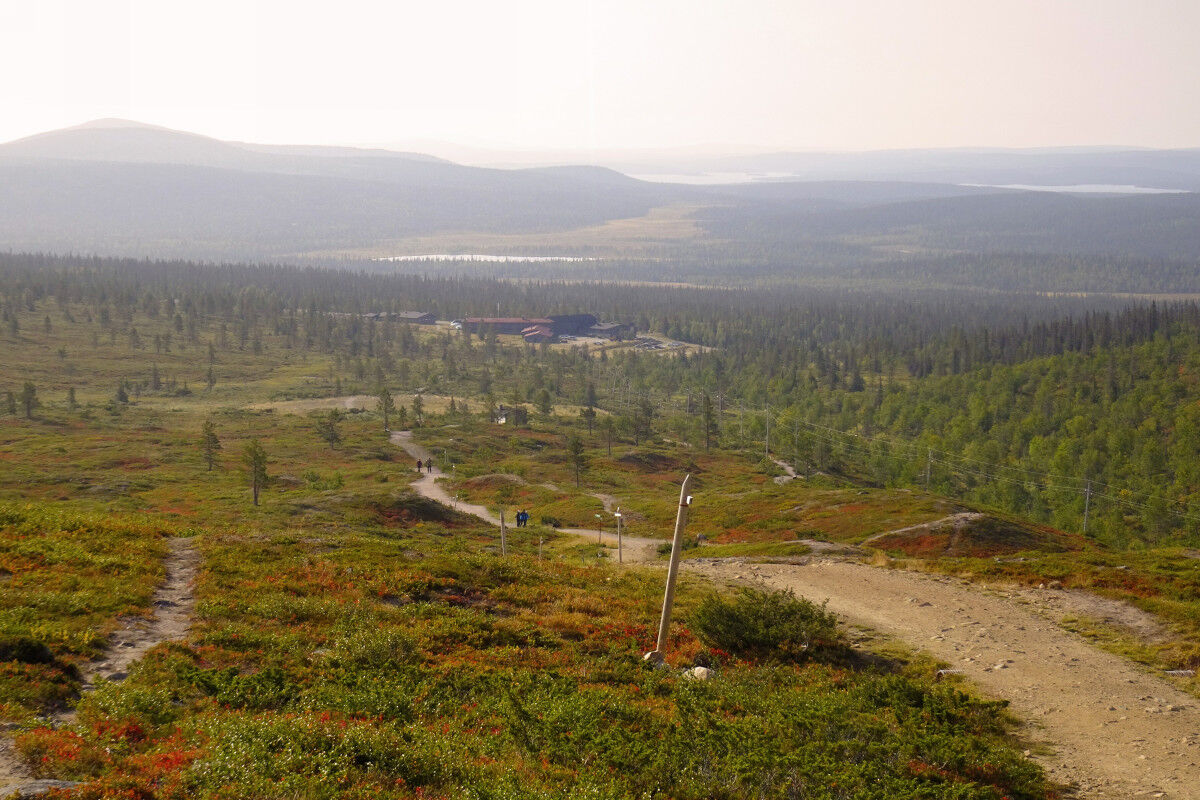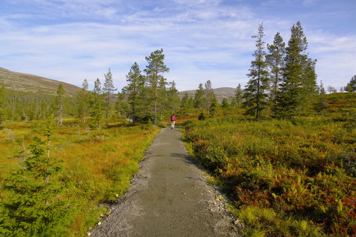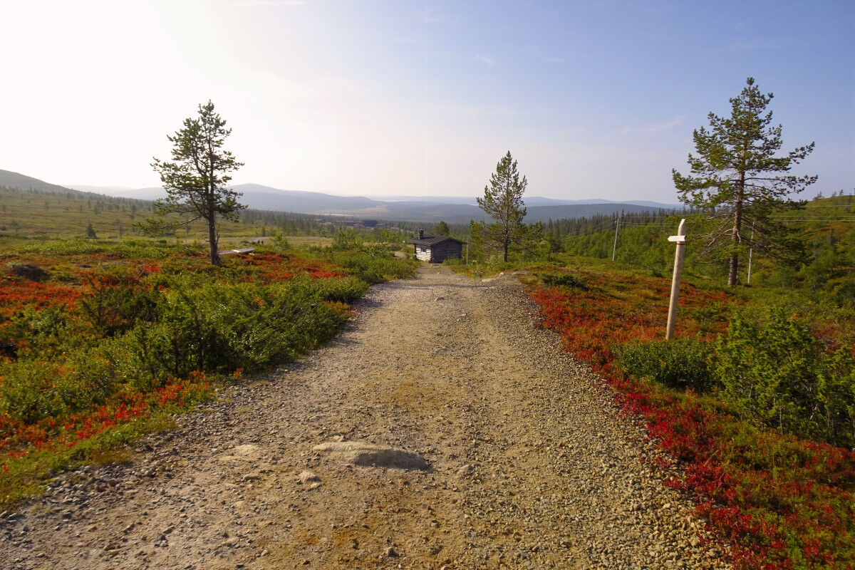 Unsere Wanderung beginnt beim Hotel Pallas bzw. beim Naturzentrum Pallastunturi. Wir finden mit dem Fernwanderweg Pallas-Hetta einen gut ausgebauten breiten Steig vor, auf dem wir gut voran und bergauf kommen. Der schüttere Waldbewuchs nimmt immer mehr ab.
