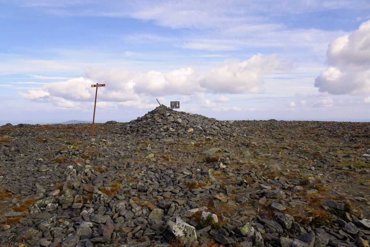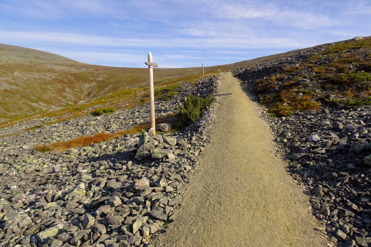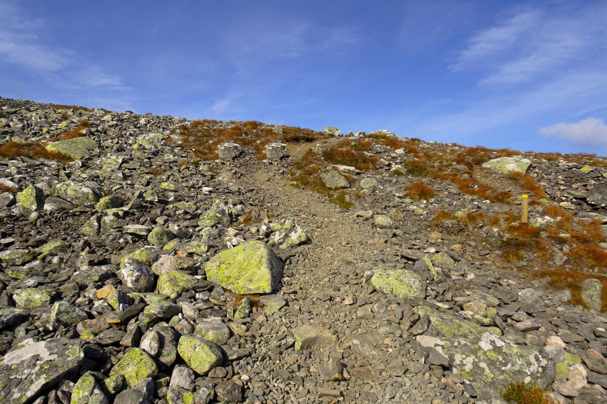 Unser Aufstiegsweg steigt weiterhin als breiter, steiniger Pfad aufwärts bis zu einem Pass. Geradeaus zeigt hier der Wegweiser mit »Hetta« den Endpunkt des 55 km langen Fernwanderweges an, der den gesamten Park durchquert. Wir zweigen nach links ab und steigen auf dem nun sehr steinigen Weg zum Kahlkopf aufwärts.