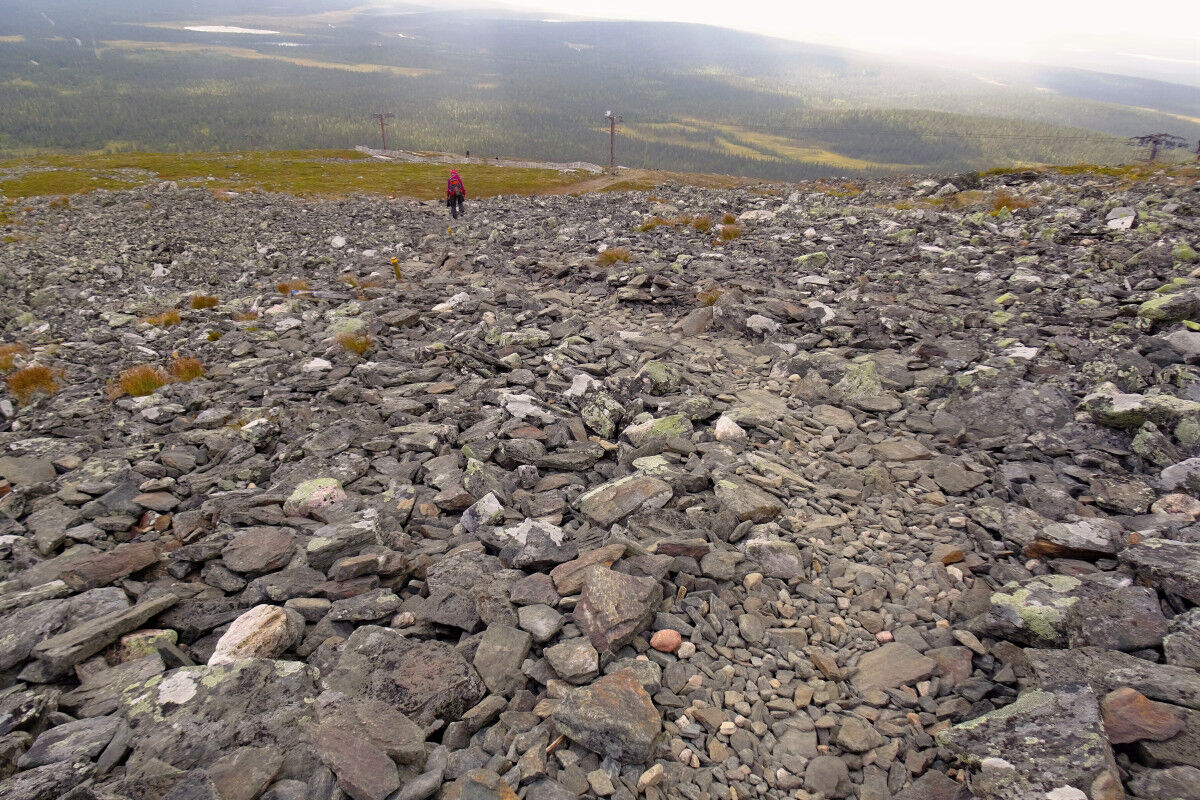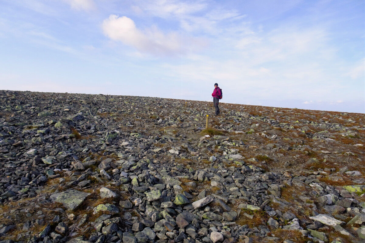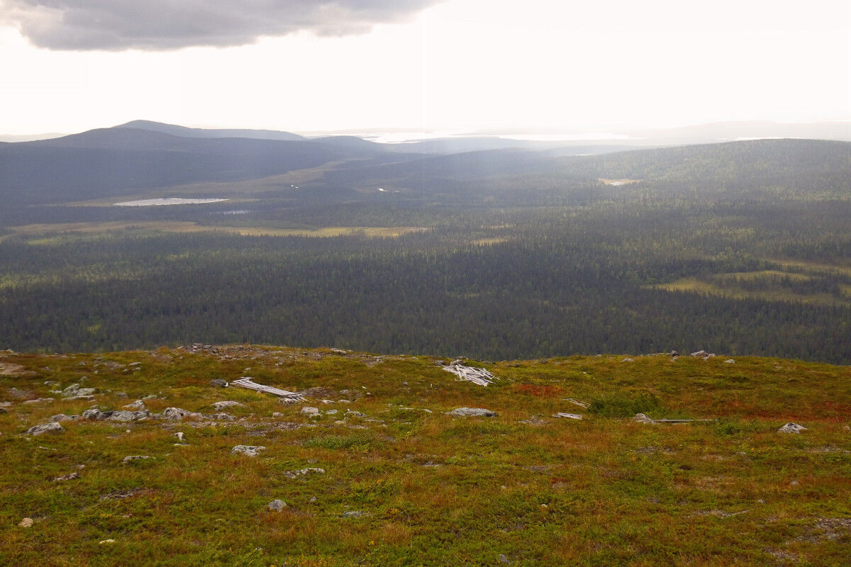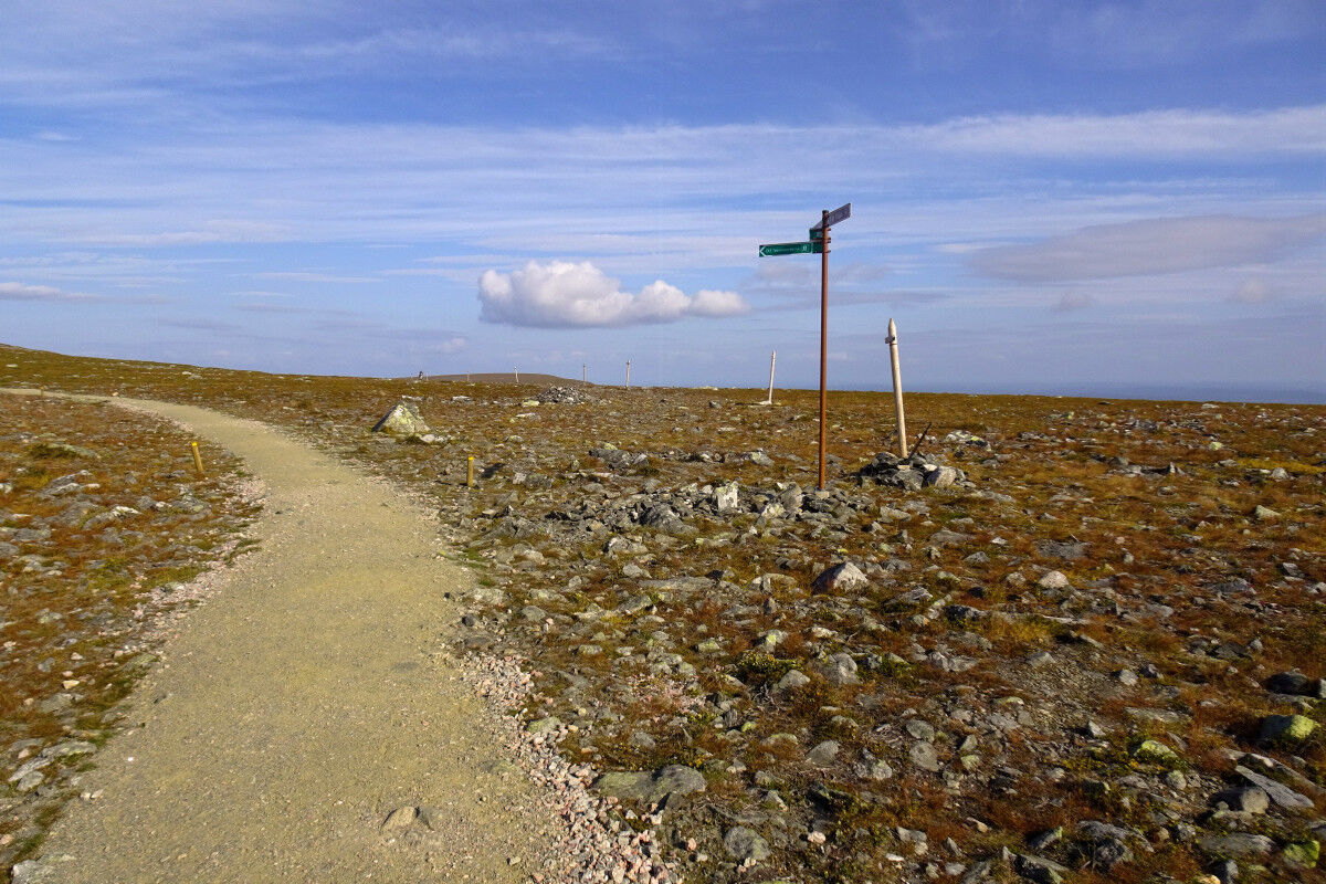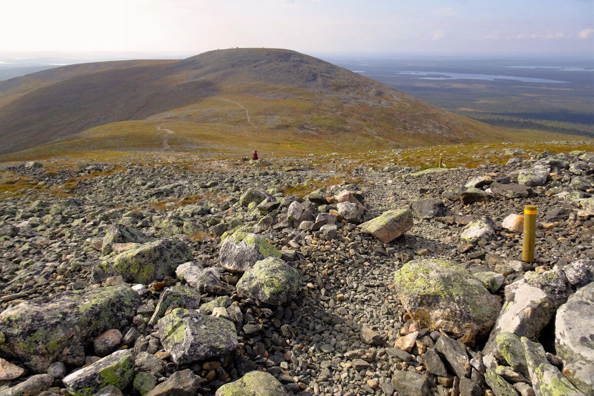 Schließlich stehen wir auf dem weitläufigen Plateau des Taivaskero, das mit Gesteinsschutt überzogen ist und einen weiten Rundblick auf die Landschaft erlaubt. Der höchsten Punkt der flachen Kuppe ist mit einer Steinsäule markiert. Daneben steht eine Steintafel, die auf das Anzünden der olympischen Flamme am 6. Juli 1952 mit Hilfe der Mitternachtssonne hinweist.