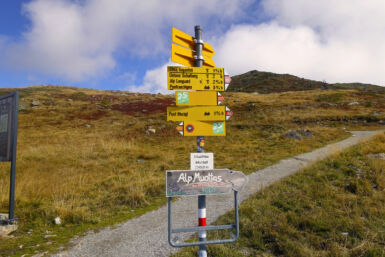 Nachdem wir das Panorama ausgiebig genossen haben, folgen wir dem Wanderweg in Richtung Alp Languard. Leicht bergab geht es am Hang entlang zur Alphütte Margun. Im Gegenhang sehen wir deutlich die Fortsetzung unserer Route. Am Talschluss des Val Muragl steigt der Weg kurz an, dabei überqueren wir einen Bach auf einem Holzsteg.
