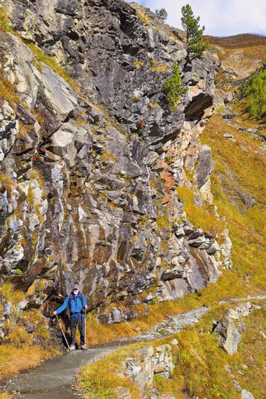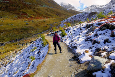 Auf dem Panoramaweg wandern wir nun um den Schafberg: zuerst auf einem Plattenweg durch ein Felssturzgebiet, dann auf einem breiten Wanderweg um die Flanke. Bald erreichen wir ein Aussichtsbänkchen, hier lohnt sich eine Rast mit schönem Blick ins Val Roseg mit den schneebedeckten Bergen im Hintergrund.