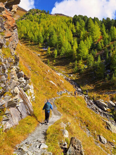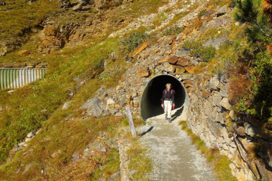 Der leicht ansteigende Höhenweg führt nun zur Alp Languard. Er quert steile Hänge, Verbauungen schützen das Tal vor Lawinen und Steinschlag, ein kurzer Tunnel schützt den Weg und uns. Noch ein kurzer Aufstieg und wir erreichen die Alp Languard mit der Bergstation der Sessellbahn.