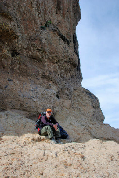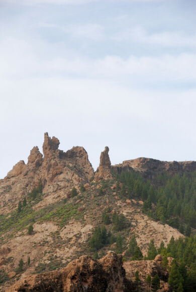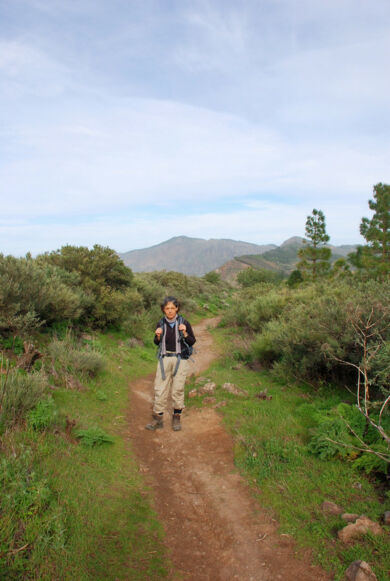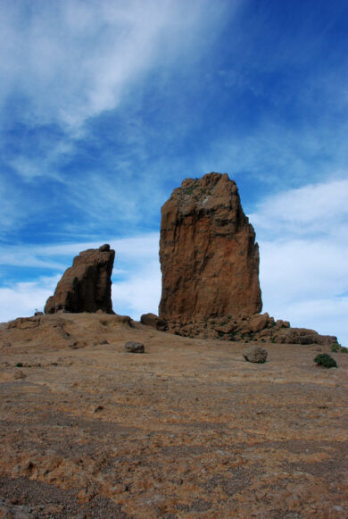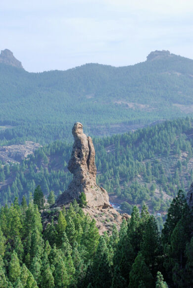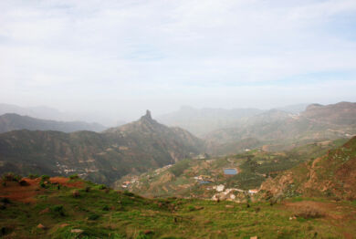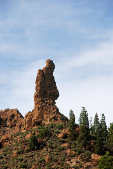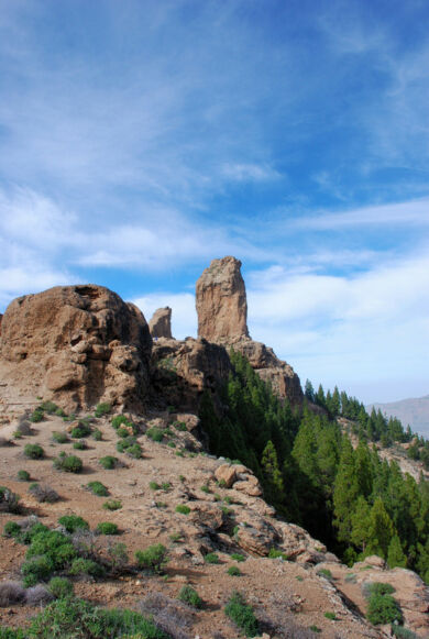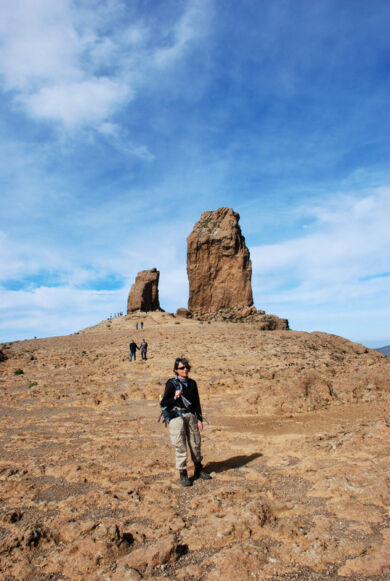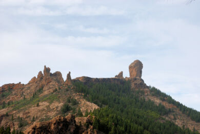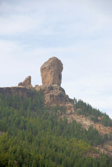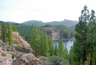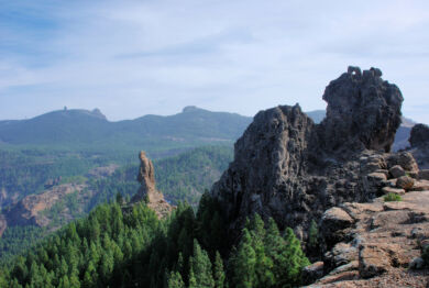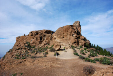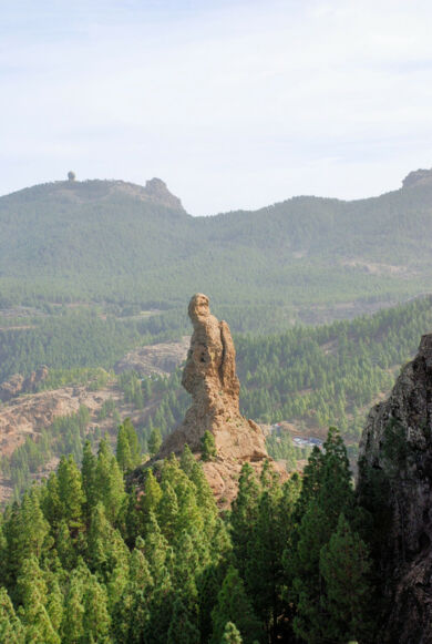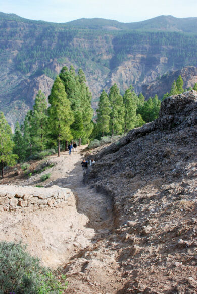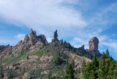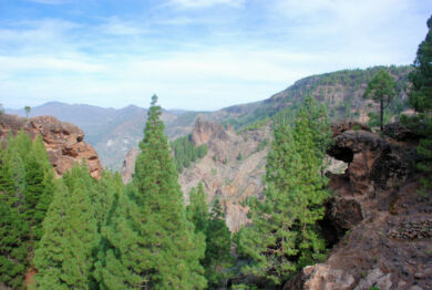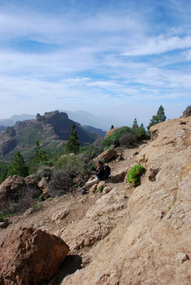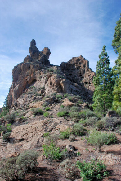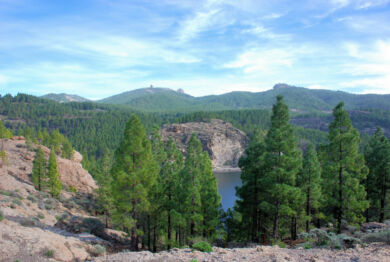 Der erste Teil unserer Wanderung ist ein herrlicher Panoramaweg entlang der steilwandigen Caldera de Tejeda – hier bleibt uns viel Zeit, die imposante Gebirgsszenerie zu genießen: neben uns eine tief eingeschnittene Schlucht, vor uns kiefernbestandene Hänge. Nach dem Panoramaweg passieren wir den kleinen Stausee Embalse de los Hornos. Dann geht es aufwärts, teilweise auf einem in den Fels geschlagenen Steig, und wir erreichen das weite Nublo-Plateau. Am oberen Ende sehen wir links den kleineren Felsen Frosch (La Rana), daneben ragt der Wolkenfels majestätisch in den blauen Himmel.