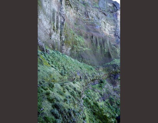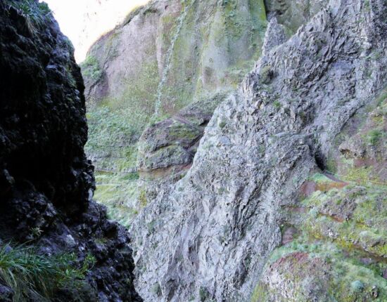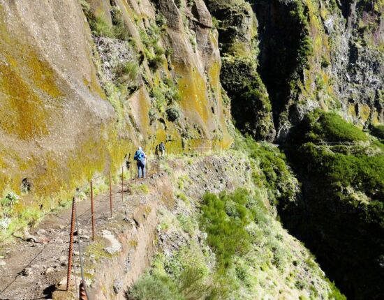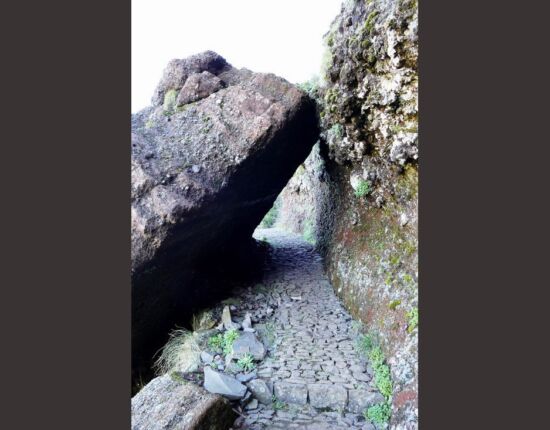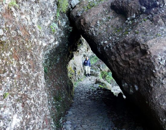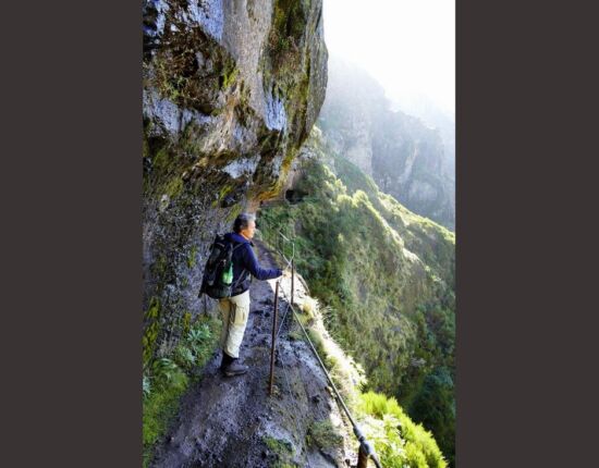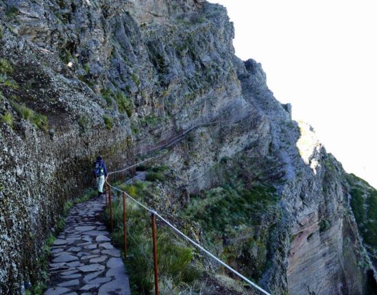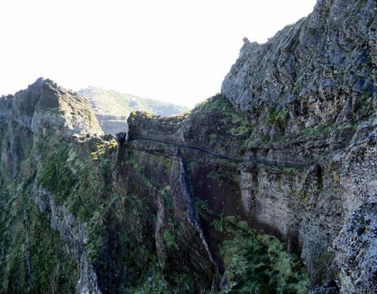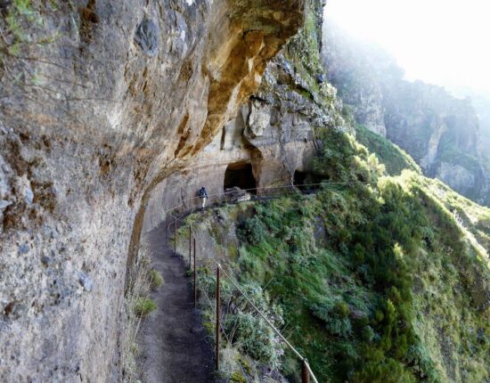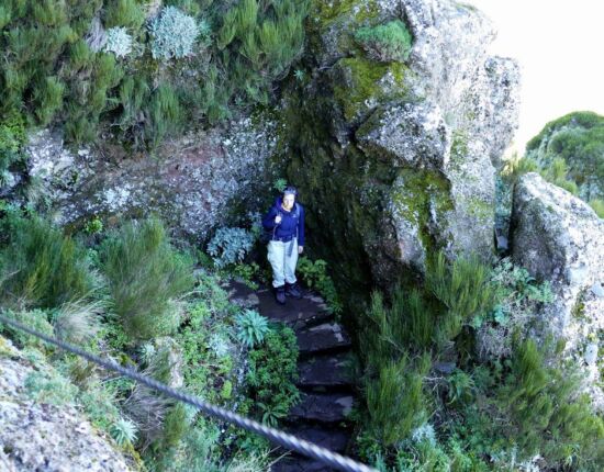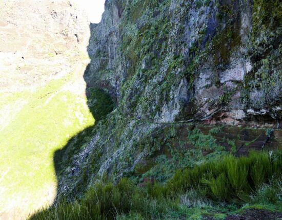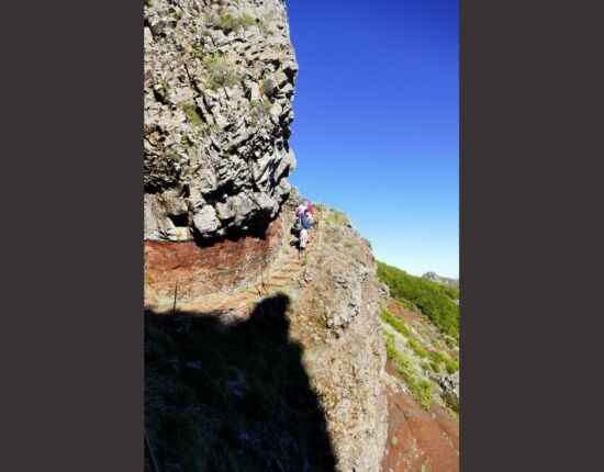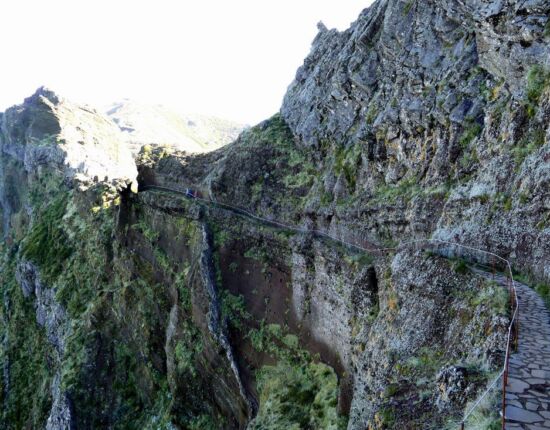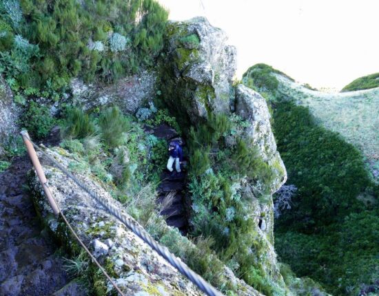 Hier gäbe es zwei Alternativen: den aussichtsreichen und etwas längeren Ostweg, der sich außen um den Hang des Pico das Torres herumschlängelt, und den etwas kürzeren Westweg, der stellenweise auf spektakuläre Art in die Felswand gehauen ist und einige Tunnel durchläuft. Die Ostroute ist seit 2017 wegen Steinschlag und Erdrutsch gesperrt, war es auch Anfang 2019 und wird es wohl noch länger sein. Infos darüber finden sich z.B. auf http://www.visitmadeira.pt/de-de/nutzliche-info/wanderungen/warnhinweis-fur-wanderer-und-liste-den-wanderwege .