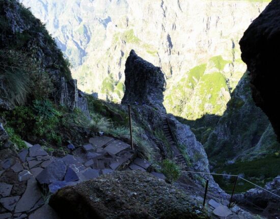 Gleich am Anfang verläuft der Weg spektakulär und ausgesetzt über schmale Grate zum Miradouro Ninho da Manta, dem „Bussardnest”. Kommt man von diesem Aussichtspunkt zurück, geht es geradeaus weiter über eine Natursteintreppe ein kurzes Stück hinauf und dann in leichtem Auf und Ab weit oberhalb eines Seitentals von Curral das Freiras. Es folgen zwei schmale Grate, die aber auf beiden Seiten gut gesichert sind. An einer zweiten Aussichtsstelle mit einem aus Tuff gehauenen Tisch ergeben sich nochmals beeindruckende Ausblicke. Nach diesem Aussichtspunkt verläuft der Weg abermals in leichtem Auf und Ab in der Steilwand, sorgfältig angelegt und gut gesichert. Bald sind sehr steile Stufen bergab zu überwinden. Nach Passieren eines runden Felstores ist gleich ein Tunneleingang erreicht. Der sorgfältig gepflasterte Tunnel führt durch den Pico do Gato, er ist schnell durchquert. Am Ende führen erneut Stufen bergab. Und nach einer extrem steilen Natursteintreppe gelangt man unten an eine Weggabelung.