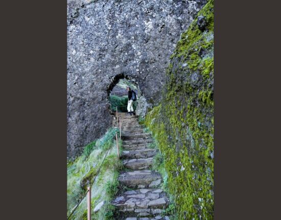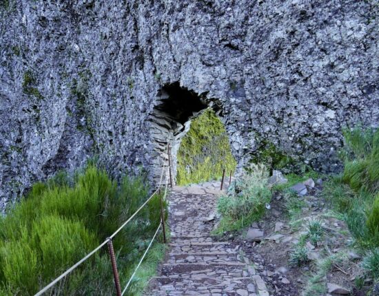 Gleich am Anfang verläuft der Weg spektakulär und ausgesetzt über schmale Grate zum Miradouro Ninho da Manta, dem „Bussardnest”. Kommt man von diesem Aussichtspunkt zurück, geht es geradeaus weiter über eine Natursteintreppe ein kurzes Stück hinauf und dann in leichtem Auf und Ab weit oberhalb eines Seitentals von Curral das Freiras. Es folgen zwei schmale Grate, die aber auf beiden Seiten gut gesichert sind. An einer zweiten Aussichtsstelle mit einem aus Tuff gehauenen Tisch ergeben sich nochmals beeindruckende Ausblicke. Nach diesem Aussichtspunkt verläuft der Weg abermals in leichtem Auf und Ab in der Steilwand, sorgfältig angelegt und gut gesichert. Bald sind sehr steile Stufen bergab zu überwinden. Nach Passieren eines runden Felstores ist gleich ein Tunneleingang erreicht. Der sorgfältig gepflasterte Tunnel führt durch den Pico do Gato, er ist schnell durchquert. Am Ende führen erneut Stufen bergab. Und nach einer extrem steilen Natursteintreppe gelangt man unten an eine Weggabelung.