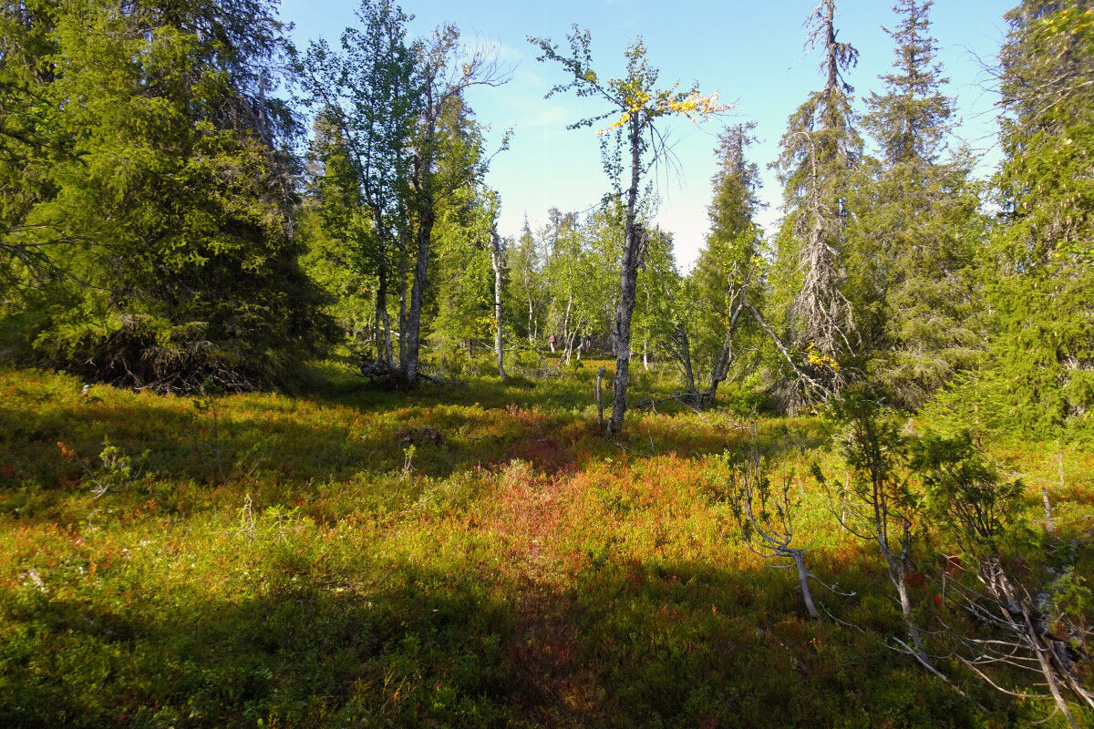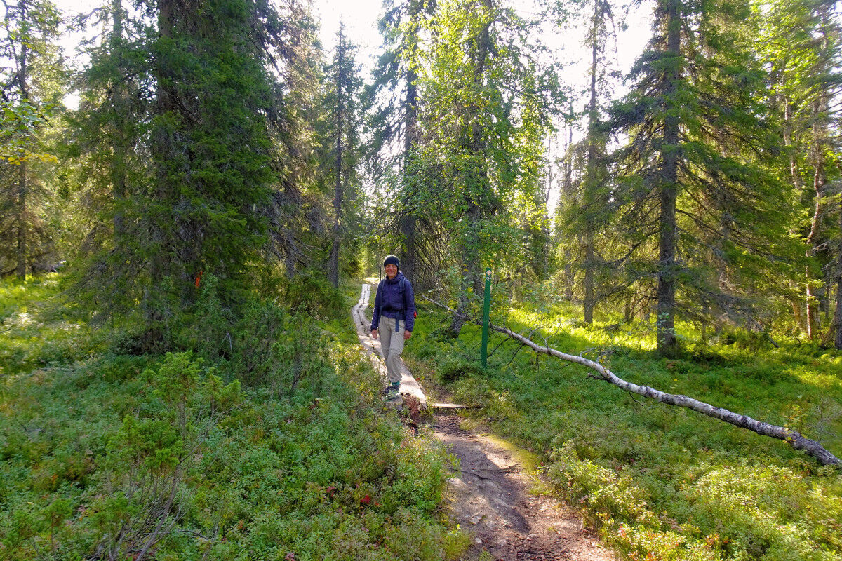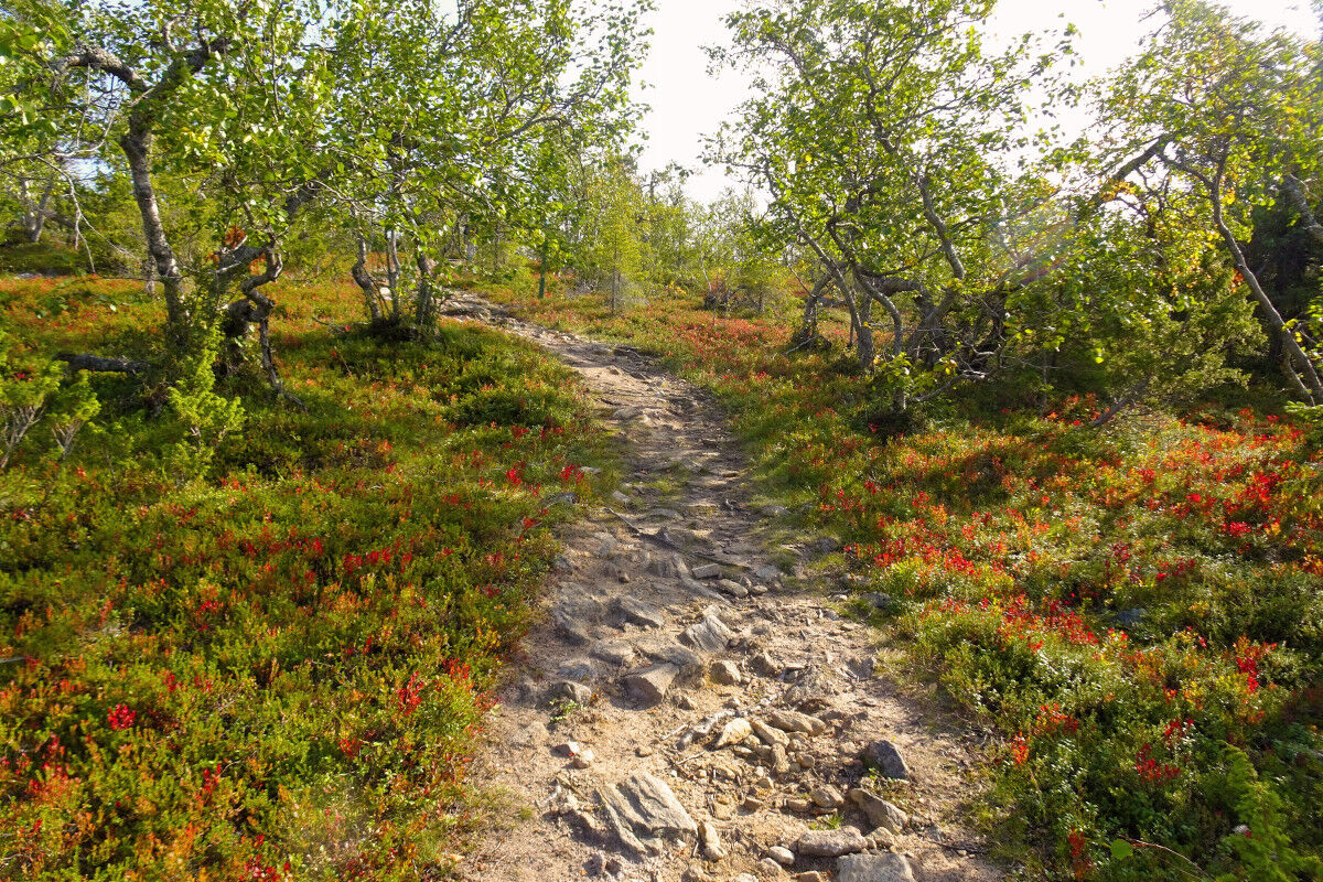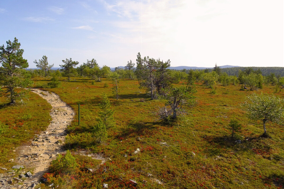 Die Wegmarkierung – weißer Kiefernzapfen auf orangefarbenem Grund – ist in regelmäßigen Abständen an grünen Holzstäben angebracht. Der Kuukkeli-Pfad führt nun über Holzbohlen, und steigt bald allmählich an. Während der hier schmalere und zum Teil auch steinigere Pfad steiler wird, lichtet sich der zuvor dichte Wald und macht spärlichem Birkenbewuchs Platz.