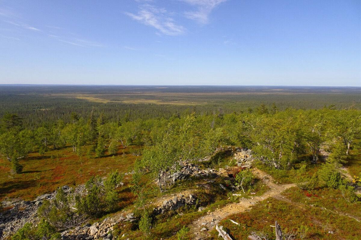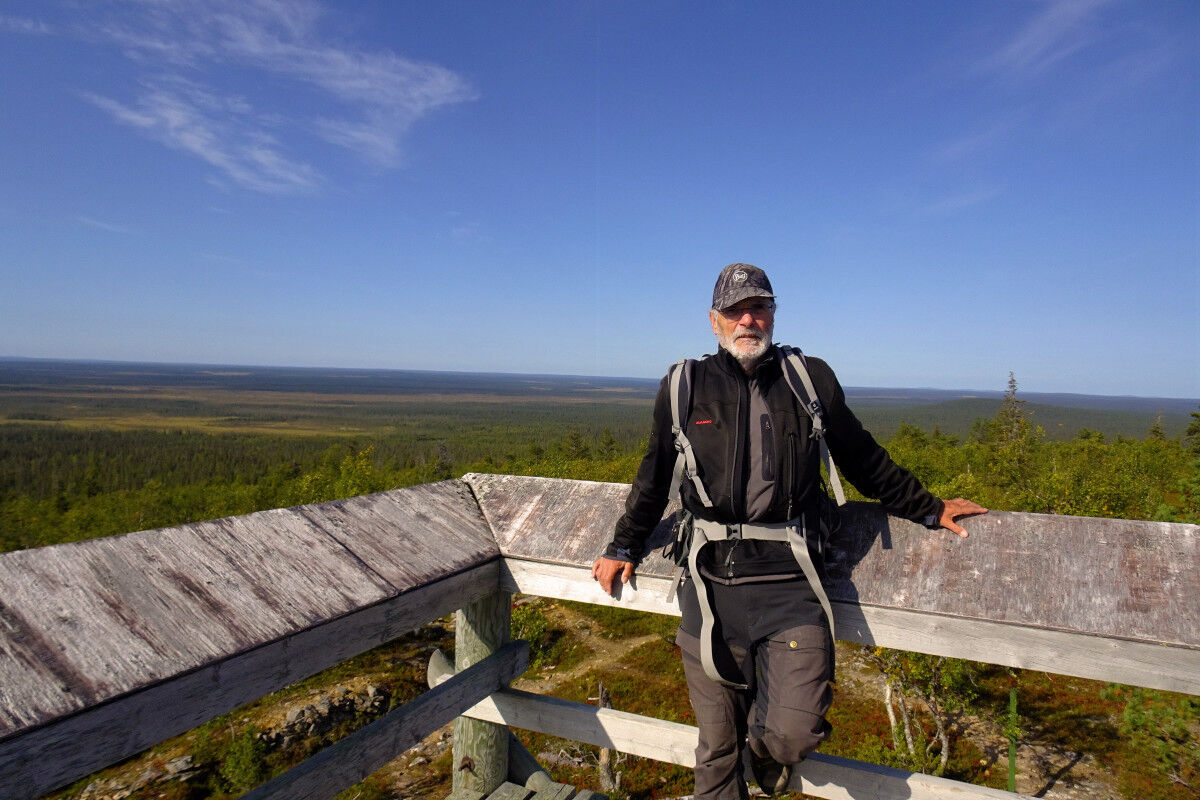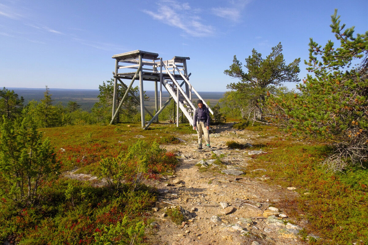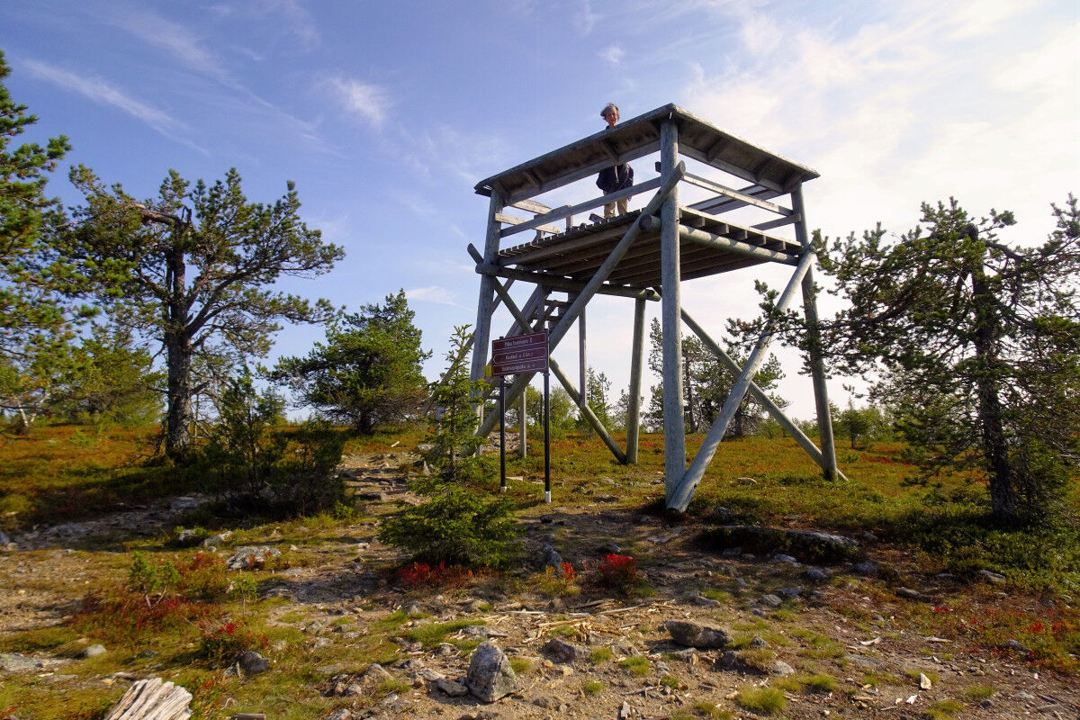 Schließlich erreichen wir das Gipfelplateau des Pikku Tankavaara, der die Baumgrenze jedoch nicht ganz überschreitet. Hier steht ein kleiner Aussichtsturm aus Holz, von dessen Plattform aus wir die Umgebung bewundern können. Aufgrund der eher geringen Höhe der umliegenden Hügel und Wälder haben wir eine fantastische Weitsicht in quasi alle Richtungen.